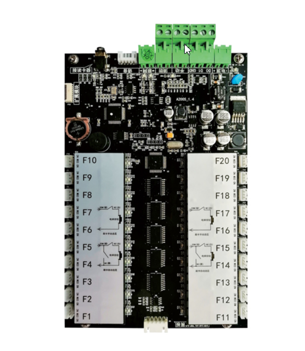 可(kě)分層管控:樓層可(kě)以分别獨立管控,一塊闆可(kě)管控20個(gè)樓層可(kě)通(tōng)過擴展闆管控達80個(gè)樓層雙繼電(diàn)器(qì)無源輸出:20路無源觸點輸出,每層用兩個(gè)繼電(diàn)器(qì)獨立控制(zhì)故障無影(yǐng)響電(diàn)梯使用:上(shàng)電(diàn)常開(kāi)确保梯控斷電(diàn)或故障不影(yǐng)響電(diàn)梯正常使用寬電(diàn)壓供電(diàn):可(kě)使用9~24V的電(diàn)源(電(diàn)流2A)給梯控供電(diàn)卡片容量無限制(zhì),大(dà)容量存儲刷卡記錄:發卡數(shù)量沒有(yǒu)限制(zhì)刷卡記錄可(kě)存儲6萬條卡片類型: ISO4443A協議 13.56MHZ IC卡工作(zuò)電(diàn)壓: DC 9-24V通(tōng)信接口: RS485 通(tōng)訊速率: 19200bps工作(zuò)電(diàn)流: ≤430mA工作(zuò)溫度: -20℃~ 70℃ R.H環境濕度: 10%~95% R.H抗靜電(diàn)幹擾: 15KV輸出接口: 20組無源接點輸出讀卡距離: 20mm—70mm産品重量: 0.52Kg靜态功率:≤6W規格尺寸:198x120x28(mm)